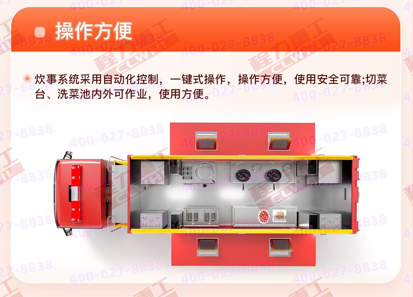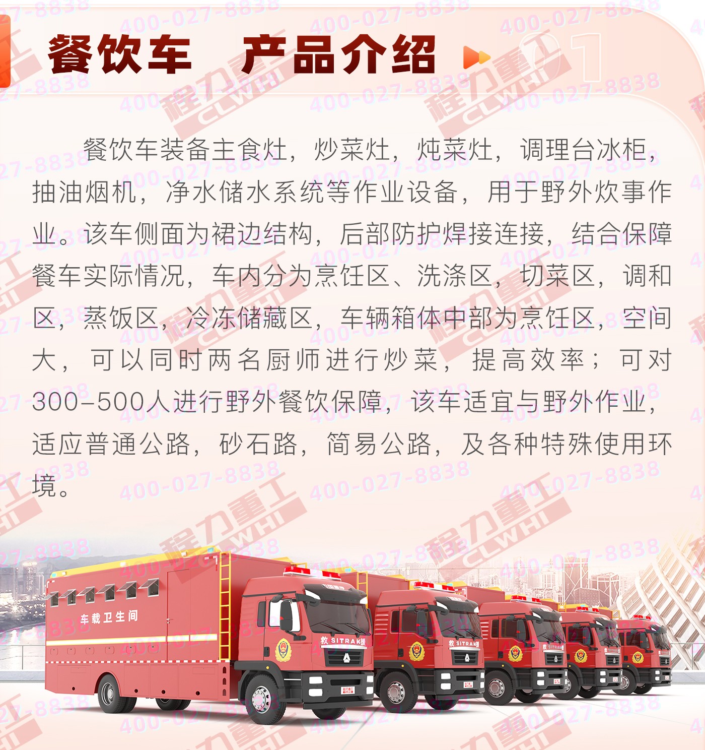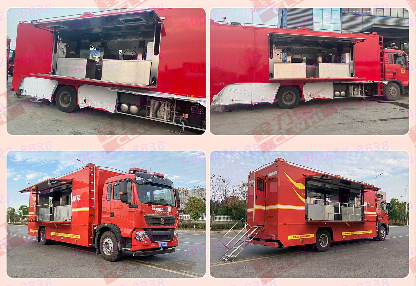 重汽HOWO炊事車:中國重型汽車集團原廠重汽豪沃6*6越野底盤,三軸5200+1400mm軸距,9726ML排量,280馬力。